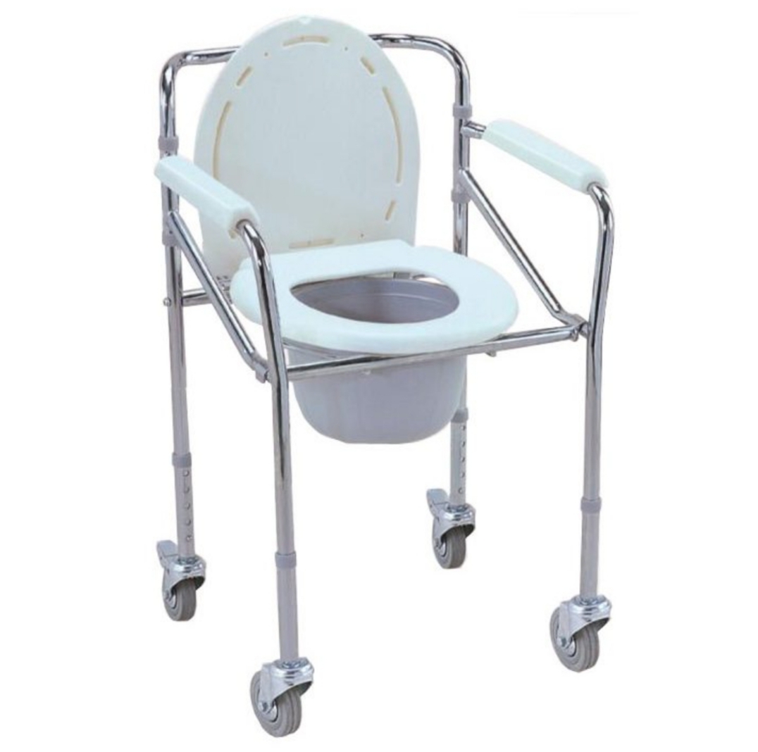 Steel mobile folding commode chair provides a convenient option for those needing an easily accessible toilet, the bariatric commode is exceptionally sturdy, being manufactured with a durable coated steel frame. The adjustable commode chair includes a standard bucket with a lid. Nonskid rubber tips on each leg provide extra stability while the soft armrests provide a comfortable, secure grip.